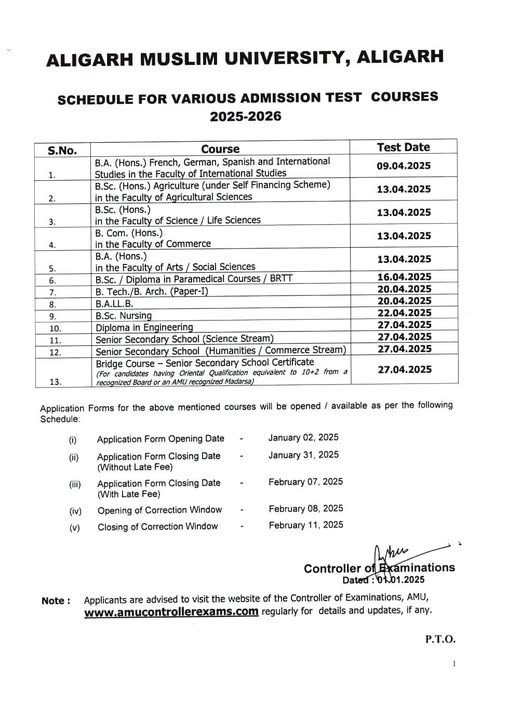 HomeNEWS NEWS Aligarh Muslim University – Schedule for Various Exam Test 2025-2026 By NewsTree Desk January 7, 2025 0 27 FacebookTwitterPinterestWhatsApp Aligarh Muslim University – Schedule for Various Exam Test 2025-2026 Share FacebookTwitterPinterestWhatsApp Previous articleIt is moment of happiness and proud for Prof. Nizamuddin Khan and Department of Geography, AMU that National Association of Geographers, India, conferred prestigious “Bhoogol Vachaspati Award 2024” to Prof. Nizamuddin in 46 NAGI conference held at Department of Geography, osmania university, Hyderabad during 27-29 December 2024.Next articleAMU faculty gets Iqbal International Award NewsTree Deskhttps://newstrees.in Related Articles NEWS فخر کی علامت علی گڑھ قلعہ آج اپنی شناخت کھونے کے دہلیز پر بے بس NEWS یونیورسٹی کی1.26 ارب کی زمین پر میونسپل کارپوریشن نے قبضہ کیا NEWS बत्ती गुल तहरीक, एक खामोश पैग़ाम LEAVE A REPLY Cancel reply Comment: Please enter your comment! Name:* Please enter your name here Email:* You have entered an incorrect email address! Please enter your email address here Website: Save my name, email, and website in this browser for the next time I comment. Stay Connected0FansLike0FollowersFollow0SubscribersSubscribe - Advertisement - Latest Articles NEWS فخر کی علامت علی گڑھ قلعہ آج اپنی شناخت کھونے کے دہلیز پر بے بس NEWS یونیورسٹی کی1.26 ارب کی زمین پر میونسپل کارپوریشن نے قبضہ کیا NEWS बत्ती गुल तहरीक, एक खामोश पैग़ाम NEWS अब AMU टीचर्स क्यों उतरे सड़कों पर…? NEWS वो स्पीच जिसके बाद VC ने कर लिया था तलब, Load more